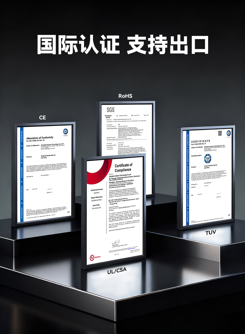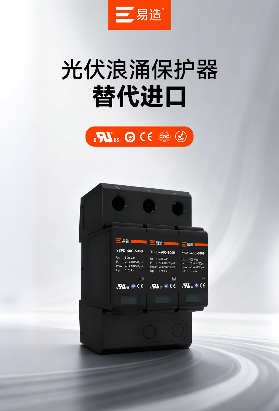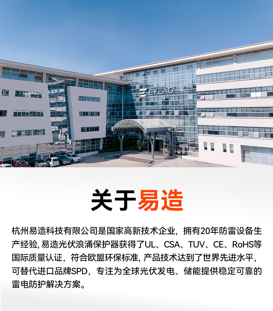 易造光伏浪涌保護器,直流電壓涵蓋100Vdc至1800Vdc,擁有UL、CSA、TUV、CE、CQC等國內外質量認證,符合全球市場的最高質量和歐盟環保標準,穩過驗收,可替代進口品牌SPD,支持出口。