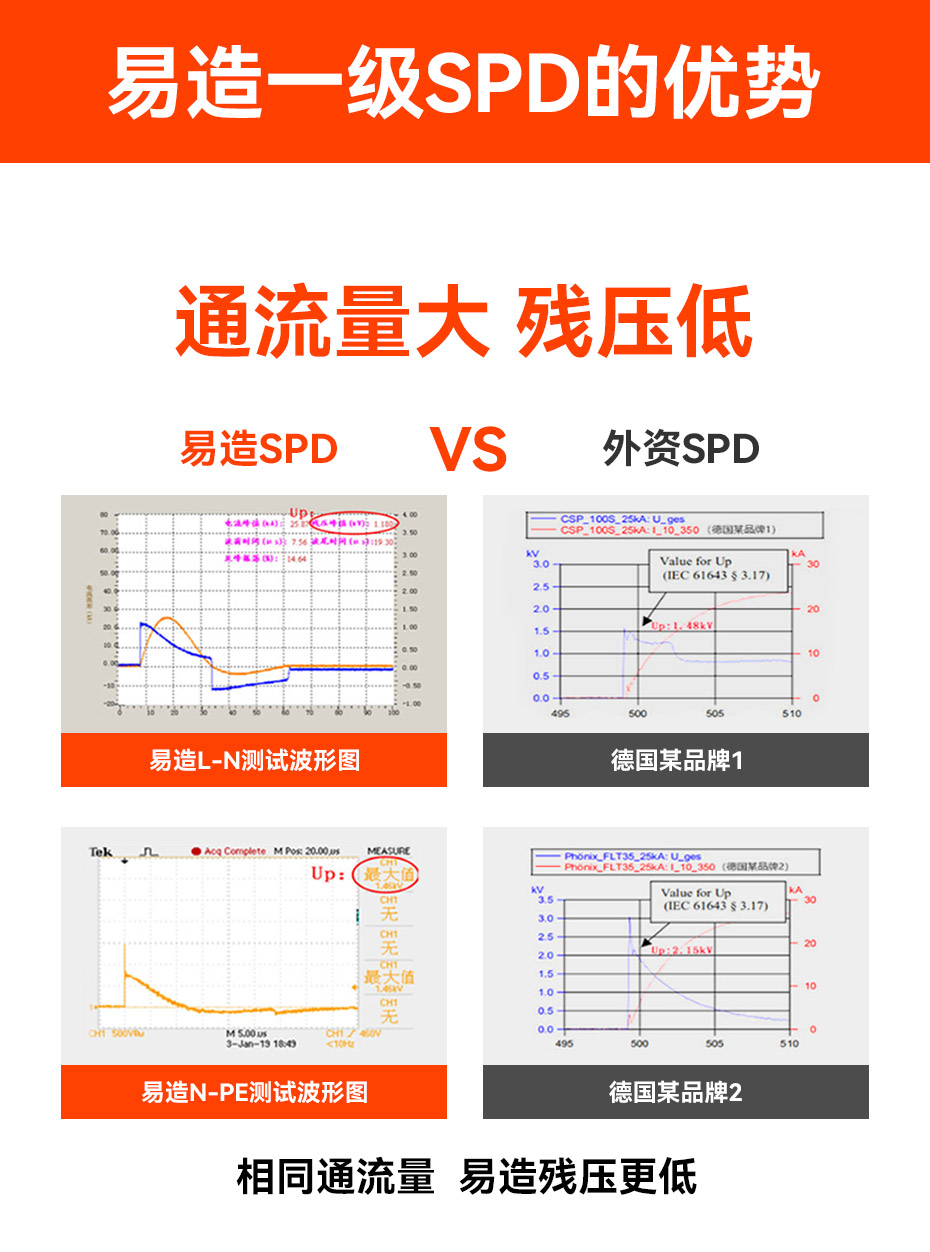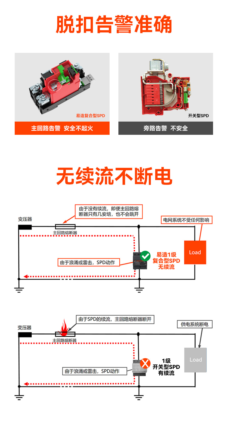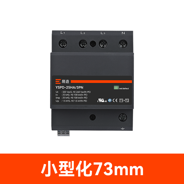 易造T1級浪涌保護器采用MG復合型技術,無續流無漏電流,有效解決了傳統SPD易斷電易老化的短板缺陷,可長期耐受諧波過電壓,使供電系統更加穩定。小型化設計每相寬度僅一個模數(18mm)使配電箱空間更充裕。易造T1級SPD采用主回路脫扣裝置,當SPD承受過電壓時,即便是小電流也會導致脫扣裝置脫扣,主回路斷開無電流流過避免燃燒,從而避免誤告警。