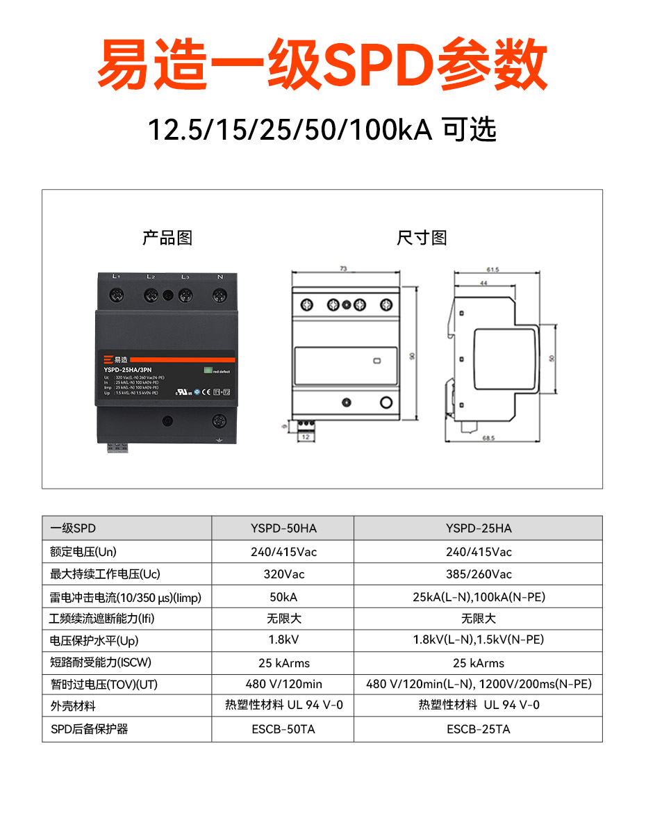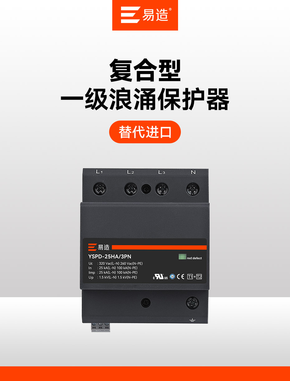 一級浪涌保護器通常安裝于獨立的總配電箱或主配電柜總進線處,對電源傳輸線路遭受直接雷擊時的巨大能量進行泄放,防止電氣設備過電壓損壞。易造YSPD系列T1類大通流SPD是能量協調的雷電流保護器,無需連接額外的線纜或安裝退耦器就能實現與二級浪涌保護器之間的能量協調,簡化了不同SPD級別間的安裝,使上下級SPD安裝更靈活。