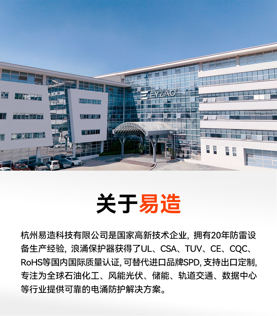 易造T1級浪涌保護器12.5kA-100kA規格型號齊全,嚴格執行國內國際各項標準,獲得了UL、CSA、TUV、CE、CQC等多項權威認證,確保了易造SPD在各種環境下的適用性和可靠性,可廣泛應用于軌道交通、石油化工、港口碼頭、風力發電、儲能系統、冶金、機場、醫院、煙草、市政等行業領域。